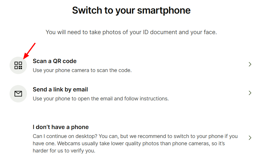 본인 인증을 위해서는 아래와 같이 본인 핸드폰을 통해 QR 코드를 스캔하고 이후 본인 여권이나 신분증을 촬영하여 업로드하고 본인 셀피를 직접 카메라로 찍어 인증하시면 됩니다.