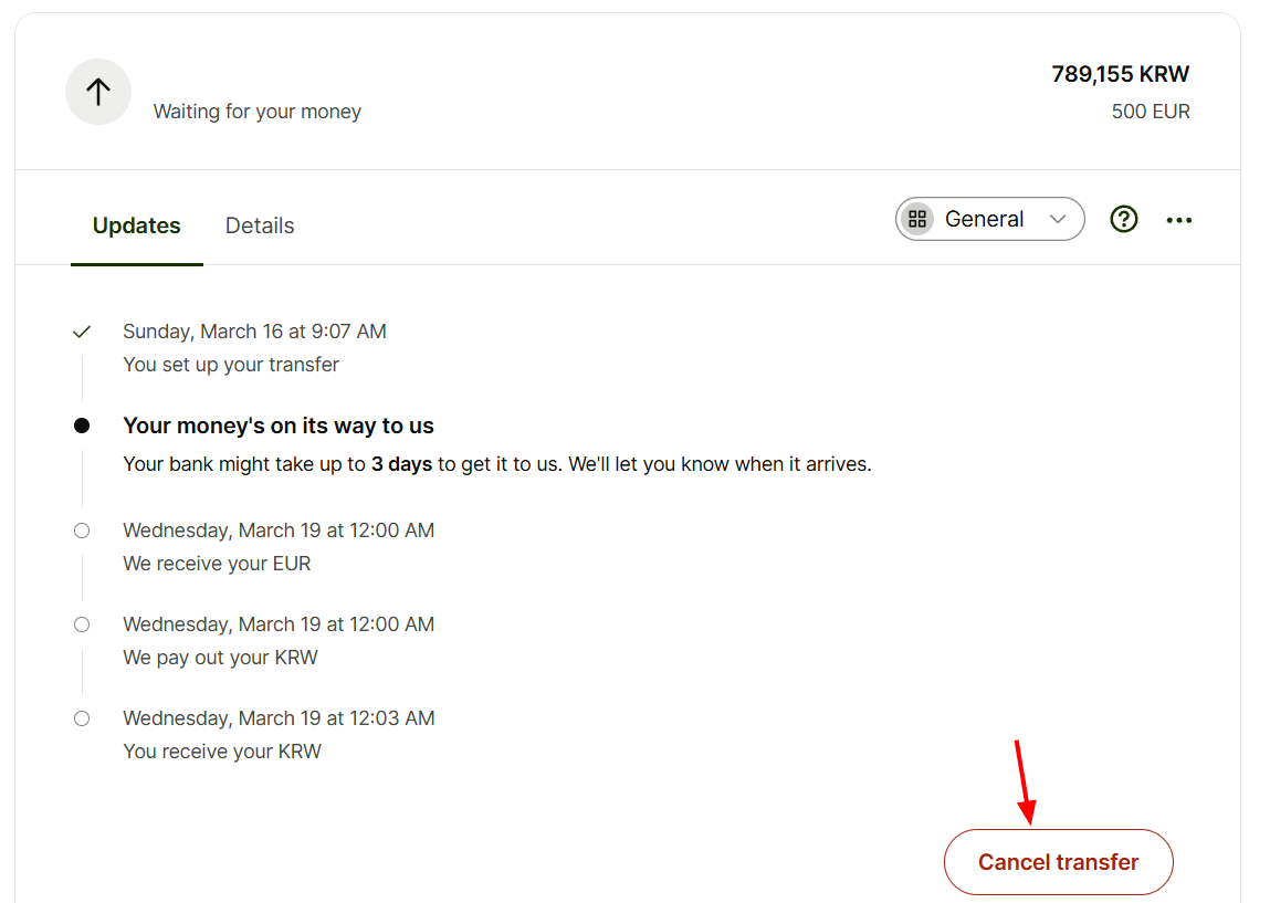 만약 Wise 송금을 취소하고 싶으시다면 해당 화면에서 'cancel transfer'를 선택하여 이를 취소할 수도 있으니 참고하시기 바랍니다.