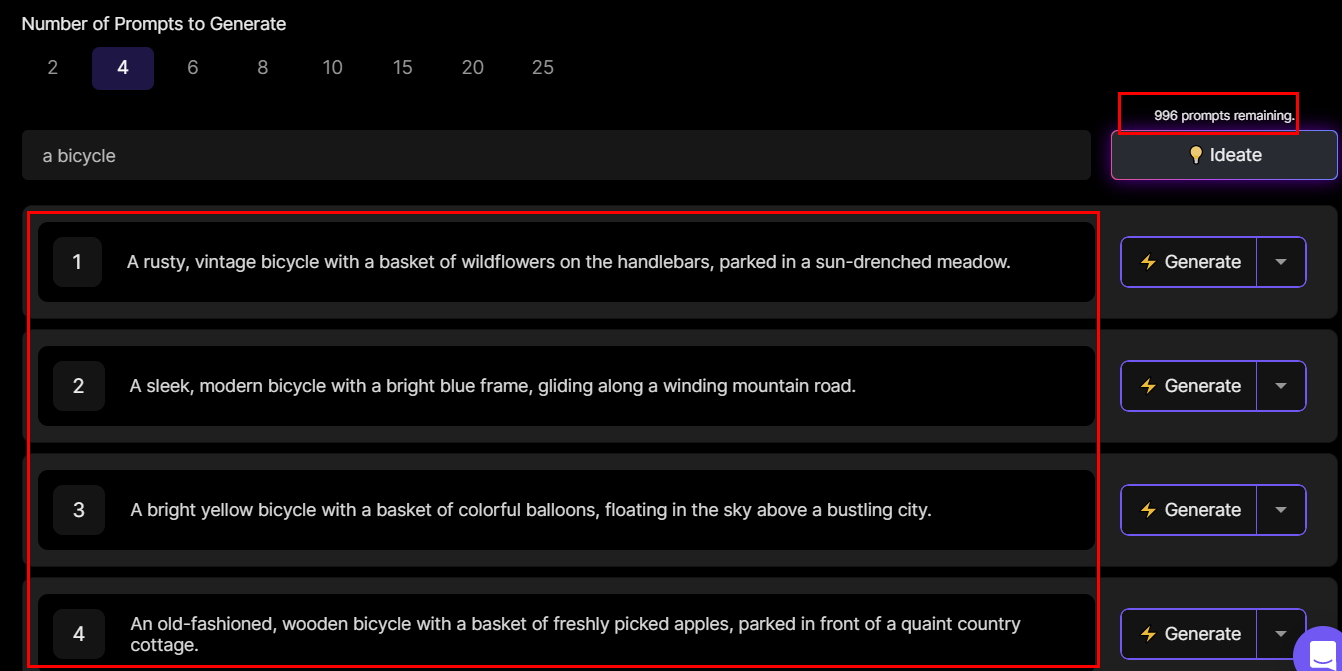 텍스트 프롬프트 아이디어를 얻으시려면 아래 그림과 같이 'Prompt Generation' 메뉴로 이동하신 후 생성할 텍스트 프롬프트의 갯수와 함께 텍스트 프롬프트에 사용될 주요 단어 (아래 예제: a bicycle)를 작성하시고 'ideate' 버튼을 클릭하시면 됩니다.