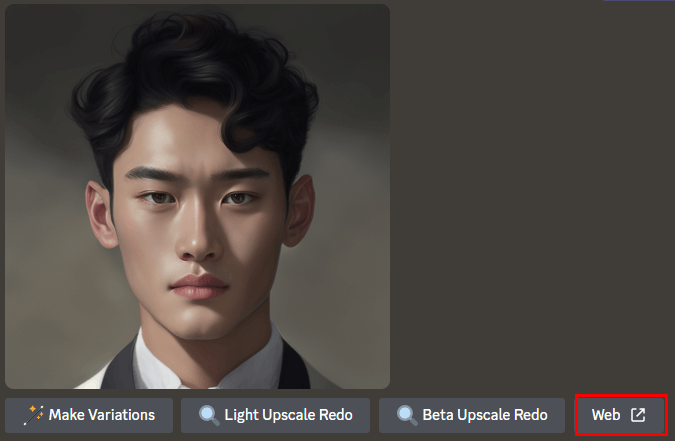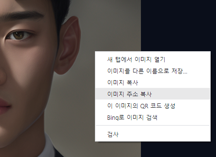 만약 본인이 미드저니에서 생성한 ai 그림을 이미지로 사용하여 재 프롬프트를 진행하고자 한다면, 아래 그림에서와 같이 upscale 한 ai 그림에서 'Web' 항목을 선택한 후, 팝업 되는 이미지의 주소를 복사하셔서 다음 프롬프트에 사용하시면 됩니다.