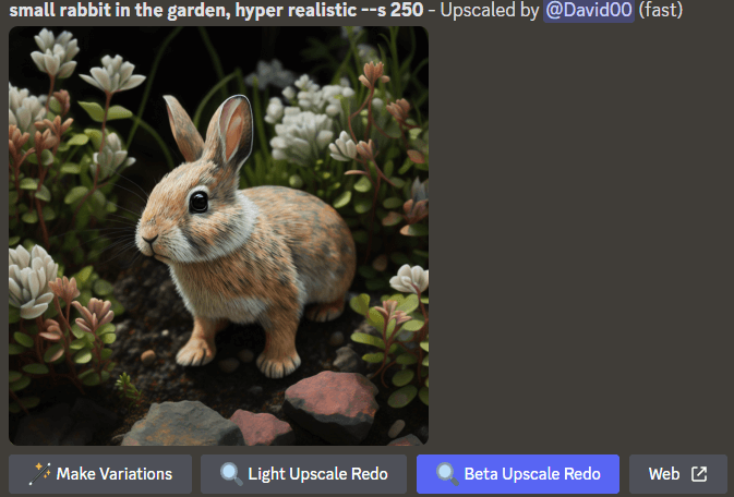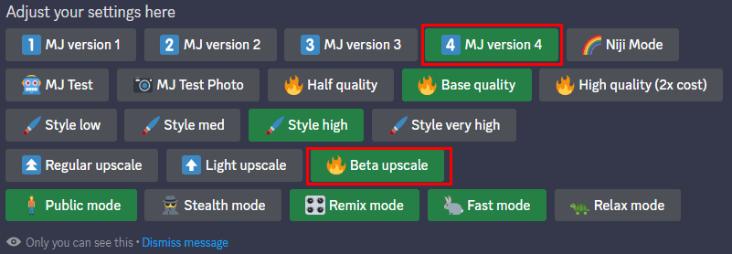 가장 많이 사용되는 MJ V4의 경우 beta upscale을 적용 시 최대 크기가 2048 * 2048까지 확대될 수 있으며, beta upscale은 '/settings' 메뉴에서 지정할 수도 있습니다.