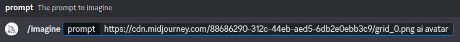 제 경우에는 미드저니에서 생성한 AI 그림의 이미지를 복사한 후 이를 'imagine' 명령어 뒤에 이미지 프롬프트로 사용하고 텍스트 프롬프트로써 단순히 'AI 아바타'라고 작성하여 무료 AI 아바타 만들기를 시도해 보았습니다.