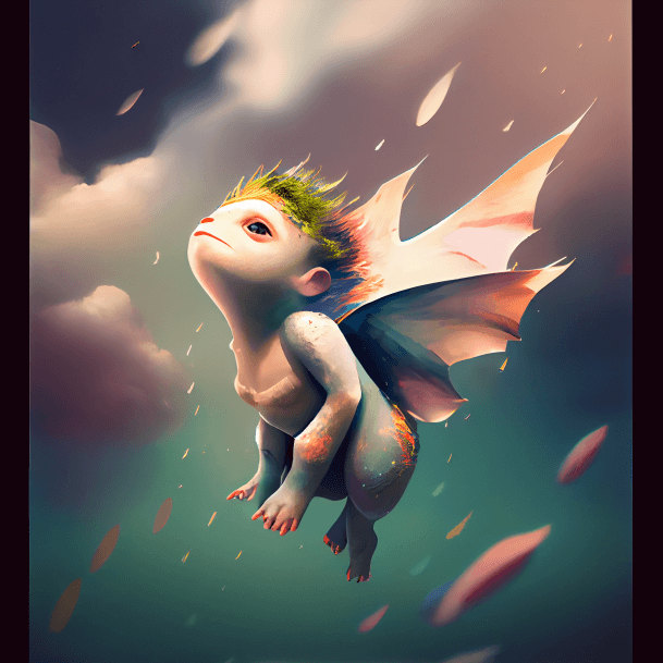미드저니 이미지 프롬프트를 활용한 또 하나의 예로 아래 왼쪽의 작은 공룡을 땅 위가 아닌 하늘에서 나는 모습으로 변경해 보았습니다.