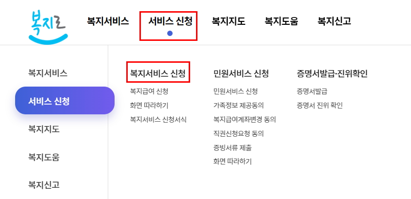 이뿐만 아니라 복지로 사이트를 통해 직접 관련 서비스를 신청할 수도 있는데, 이는 복지로 사이트 메인 메뉴에서 '복지서비스 신청'을 클릭하시면 가능합니다.